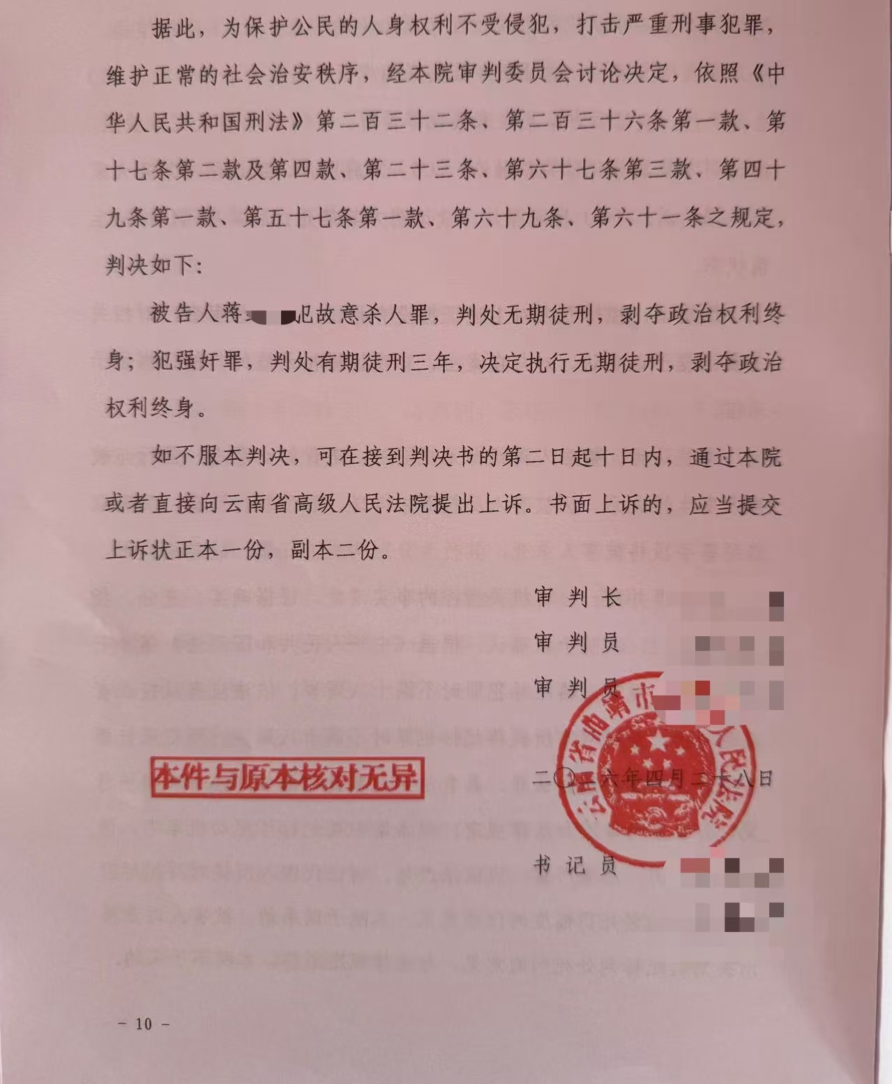 据曲靖市中级人民法院消息,4月8日下午,云南省曲靖市中级人民法院一审公开宣判被告人蒋某某故意杀人、强奸一案,以故意杀人罪、强奸罪判处蒋某某无期徒刑,剥夺政治权利终身。